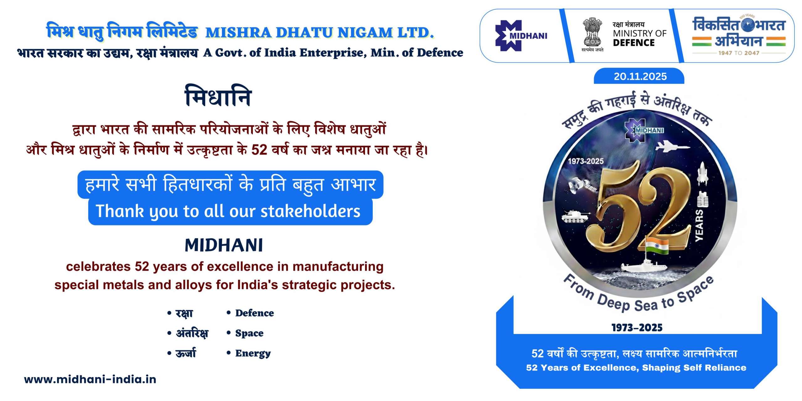 On this occasion, MIDHANI extends its sincere gratitude to its employees, partners, customers, vendors, and well-wishers for their unwavering support and trust. Their continued encouragement has been instrumental in the organization’s sustained growth and achievements.