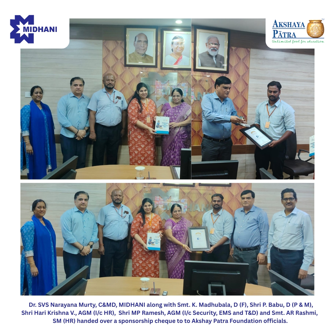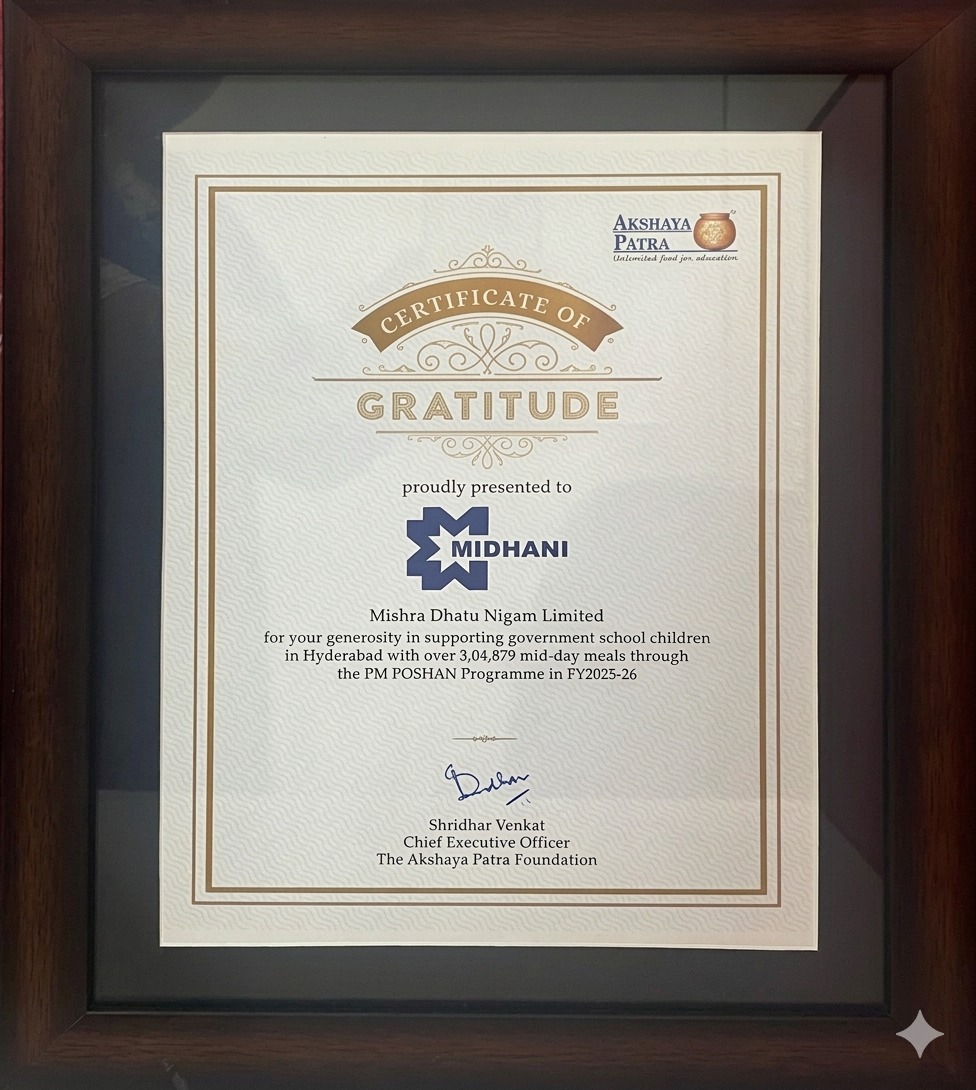 Under its CSR initiative, MIDHANI supported Government school children in Hyderabad through sponsorship of 3,04,879 mid-day meals in association with The Akshaya Patra Foundation through the PM Poshan Program in FY 2025-26.