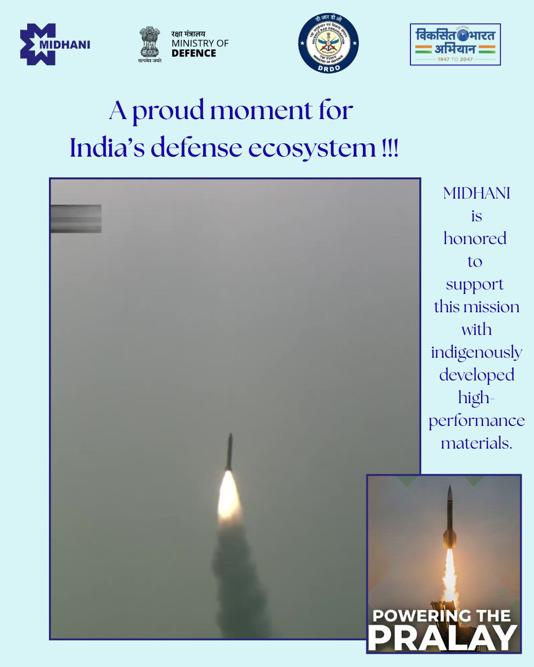 MIDHANI is proud to support this landmark achievement by supplying indigenously developed high-performance materials, contributing to the success of critical national defence programmes and strengthening India’s self-reliant defence ecosystem.