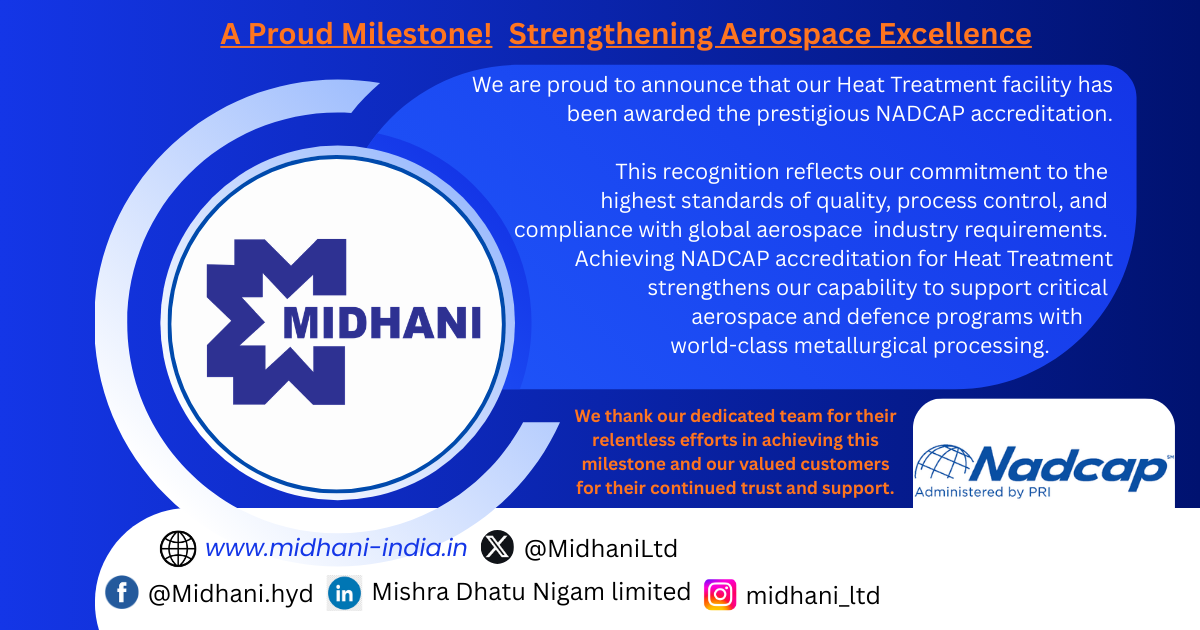 This recognition reflects MIDHANI’s commitment to the highest standards of quality, process control, and compliance with global aerospace industry requirements. Achieving NADCAP accreditation would further strengthen MIDHANI’s capability to support critical aerospace and defence programs with world-class metallurgical processing.